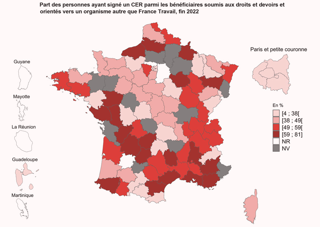 L’étude de la Drees fournit également des statistiques sur les signatures de contrat portant sur les droits et devoirs des bénéficiaires du RSA. Fin 2022, seuls 46% des bénéficiaires orientés vers un organisme autre que France Travail avaient signé un contrat d’engagement réciproque, devenu depuis "contrat d’engagement". Avec de fortes disparités territoriales, comme le montre la carte ci-dessus.