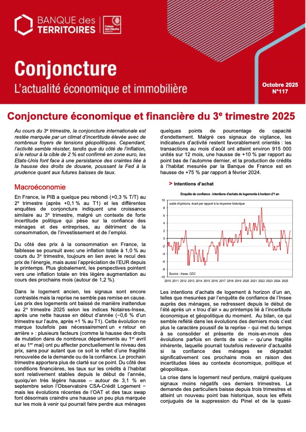 Au cours du 3e trimestre, la conjoncture internationale est restée marquée par un climat d’incertitude élevée avec de nombreux foyers de tensions géopolitiques. Cependant, l’activité semble résister, tandis que du côté de l’inflation, si le retour à la cible de 2 % est confirmé en zone euro, les Etats-Unis font face à une persistance des craintes liée à la hausse des droits de douane, poussant la Fed à la prudence quant aux futures baisses de taux.