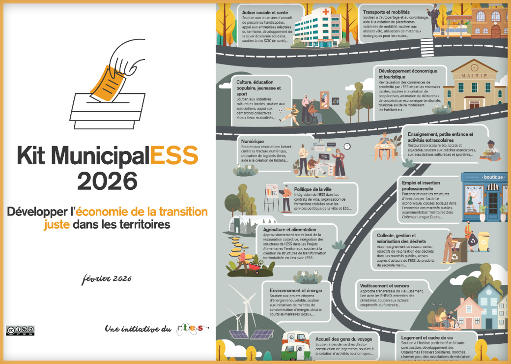 Pourquoi et comment mettre en place une politique de soutien à l'économie sociale et solidaire (ESS) ? Quels leviers les communes et intercommunalités peuvent-elles mobiliser pour favoriser le développement de l'ESS et agir avec ces acteurs au bénéfice des habitants et du territoire ? Qu'est-ce qui a déjà été expérimenté et que peuvent en dire les élus concernés ? C'est pour répondre à ces questions de façon très concrète que le Réseau des collectivités territoriales pour une économie sociale et solidaire (RTES) a créé son Kit MunicipalESS 2026, une vision largement mise à jour et enrichie par rapport à une première version diffusée en 2020 (voir notre article). Cet outil sera présenté aux élus, candidats aux élections et agents ce jeudi 26 février 2026 lors d'un webinaire.