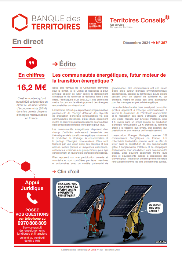 Territoires Conseils publie mensuellement la lettre « En Direct », une publication papier de quatre pages, envoyée par la poste à nos abonnés, qui présente nos travaux les plus récents. Nous proposons de découvrir le format digital de ce mois.