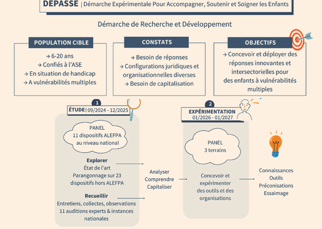 Publié le 12 mars 2026, un rapport de 300 pages vient clôturer la première phase de ce projet, qui sera suivie d'une deuxième phase plus expérimentale. Ces enfants à la croisée des sphères du médico-social et de la protection de l'enfance peuvent "mettre en difficulté les équipes et les institutions" et il n'y a "pas de consensus sur la bonne réponse" à leur apporter, a expliqué Elsa Kowalczuk, qui pilote le projet Dépasse à l'Alefpa, ce 12 mars lors d'une conférence de presse. En partant du terrain et notamment d'initiatives intéressantes, ce projet vise non pas à trouver "un modèle unique qu'il faudrait dupliquer", mais plutôt à identifier des "invariants, ce qui peut aider ou ce qui peut fragiliser la construction des réponses", a ajouté Elsa Kowalczuk. Cela en adoptant une "approche globale et décloisonnée, sans choisir un camp social ou un camp médico-social".