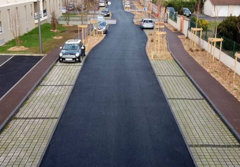 Trottoirs en enrobé drainant, stationnements en pavés végétalisés, noues et puits perdus de stockage de l'eau, aménagements pour apaiser la circulation et végétalisation… la nouvelle rue de Belleville-en-Beaujolais est née en 2023. Engagée dans un objectif de ville bioclimatique et à énergie positive d'ici 2035, la commune du Rhône décline cette approche dans toutes ses politiques publiques, dont celle de la voirie. « Jusqu'alors, les rues étaient complètement imperméabilisées et conçues pour envoyer l'eau le plus loin possible, dans une politique du tout tuyau, explique Frédéric Pronchéry, maire de Belleville-en-Beaujolais. Nous avons décidé d'inverser le principe : garder chaque goutte de pluie là où elle tombe pour éviter que nos sols argileux ne se rétractent. Nous voulons aussi profiter de ces pluies pour arroser naturellement les arbres plantés et climatiser la ville. »