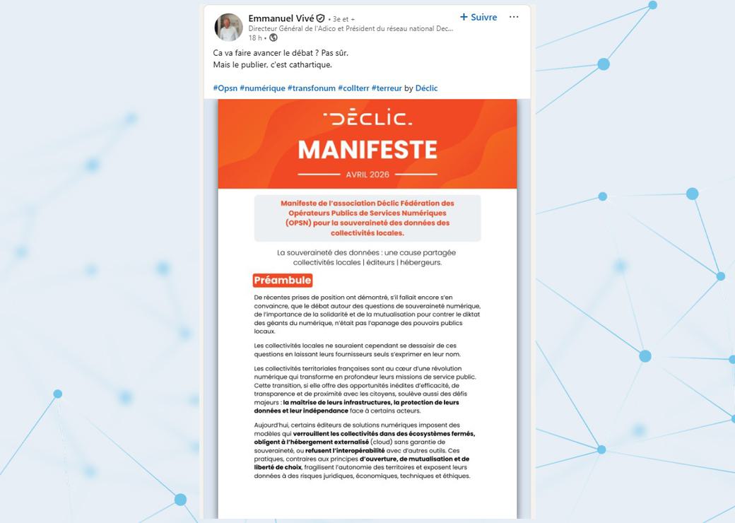 Depuis plusieurs mois, les éditeurs sont en guerre contre l'État-développeur accusé d'assécher le marché du logiciel dans la sphère publique. Bien malgré elles, les collectivités sont concernées par cette polémique, plusieurs startups d'État développant des logiciels dans des domaines où préexisterait une offre privée. C'est notamment le cas de la Suite territoriale qui vise à sécuriser les domaines, messageries et données des petites communes. Si l'État a répondu à ces critiques en publiant une circulaire clarifiant son périmètre d'intervention (notre article du 6 février 2026), Déclic a décidé de prendre la parole à son tour en sortant un manifeste. Celui-ci cible avant tout les éditeurs. On rappellera que cette fédération réunit d'importants donneurs d'ordre puisque ses quelque 80 OPSN membres équipent des centaines de communes et d'EPCI de solutions numériques mutualisées, principalement dans les territoires ruraux.