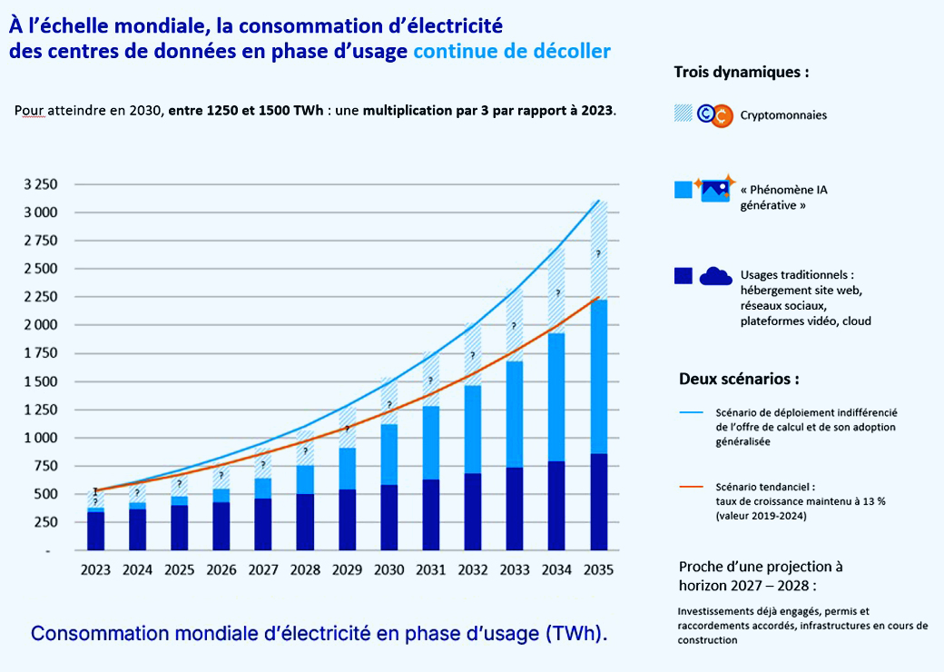 Basé sur une analyse des dynamiques du secteur, le nouveau rapport du Shift Projet intitulé "Intelligence artificielle, données, calculs : quelles infrastructures dans un monde décarboné ?" publié le 1er octobre 2025, fait état de chiffres particulièrement alarmistes. La consommation électrique des centres de données au niveau mondial a ainsi explosé passant de 165 TWh (2014) à 420 TWh (2024), hors cryptomonnaies. Elle pourrait atteindre jusqu'à 1.500 TWh/an d'ici à 2030 soit x2,8 en 7 ans. Une envolée essentiellement imputable à l'IA qui passerait de 15% des consommations en 2025, à au moins 35% en 2030. Sur ce dernier point, le rapport estime que le secteur est pris dans une boucle de rétroaction entre l'"effet d'usage" et l'"effet d'offre", justifiant des investissements exponentiels en infrastructures.