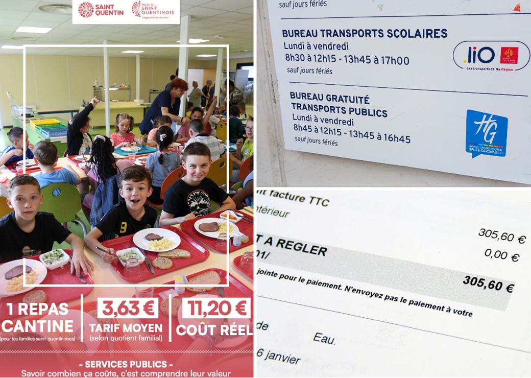 Si les tarifs financent l'intégralité du service public de l'eau et de l'assainissement, cette modalité de prise en charge tombe à 43% pour les repas servis dans les lycées publics, 20 ou 30% en moyenne pour la restauration collective assurée par les communes et 21% pour les transports en commun urbains.