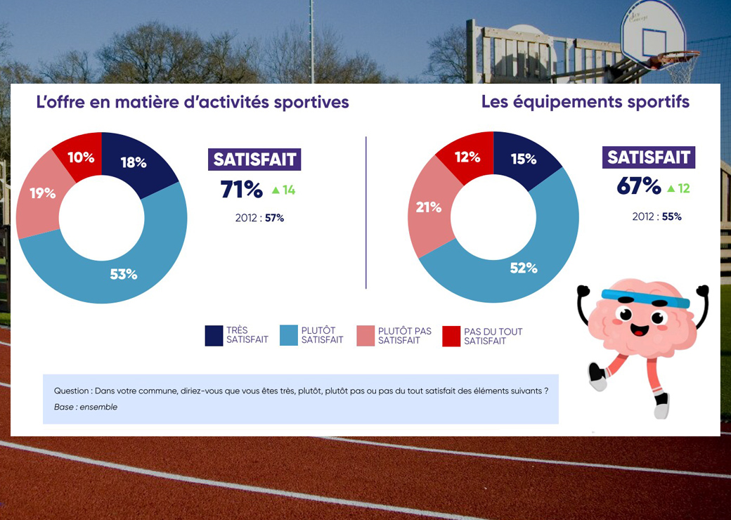 Malgré le bilan global mitigé du dernier mandat municipal, plus des deux tiers des Français sont satisfaits de l'offre sportive de leur commune. Celle portant sur les activités sportives récolte un taux de satisfaction de 71%, dont 18% de personnes très satisfaites. Ce nombre est en hausse de 14 points par rapport à 2012. Côté équipements sportifs, le taux de satisfaction s'élève à 67%, dont 15% de "très satisfaits", avec, là encore, une hausse remarquable sur le temps long : +12%.