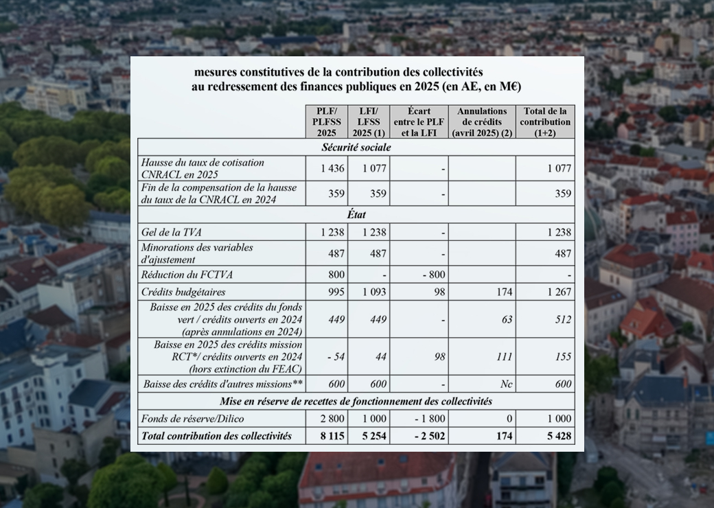 "L'effort d'objectivité" de la Cour sur le calcul de la contribution des collectivités à la maîtrise des finances publiques est salué par l'Association des petites villes de France (APVF) et ce même s’"il conviendrait", selon elle, d’ajouter "d'autres impacts indirects". De son côté, l'Association des maires de France (AMF) "note avec intérêt que la Cour qualifie de 'significative' la contribution des collectivités au redressement des finances publiques" en 2025. L'AMF avance cependant un total de "7,3 milliards d'euros", donc plus élevé que celui de la Cour. Ce résultat avait été établi dès la publication de la loi de finances pour 2025 par André Laignel, premier vice-président délégué de l'AMF. Et après la publication fin avril 2025 d'un décret d'annulation, le président du Comité des finances locales (CFL) avait relevé son chiffrage à "plus de 8 milliards d'euros".