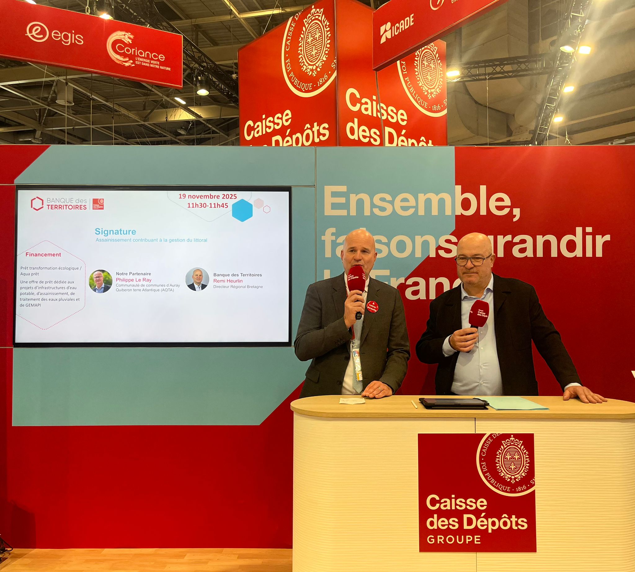 La Banque des Territoires accompagne la communauté de communes Auray Quiberon Terre Atlantique (AQTA) dans la modernisation de ses réseaux d’assainissement, à travers un financement global de 20 millions d’euros. La signature du prêt a eu lieu lors du Salon des maires de Paris, entre Philippe Le Ray, Président d’AQTA, et Rémi Heurlin, directeur régional Bretagne de la Banque des Territoires.
