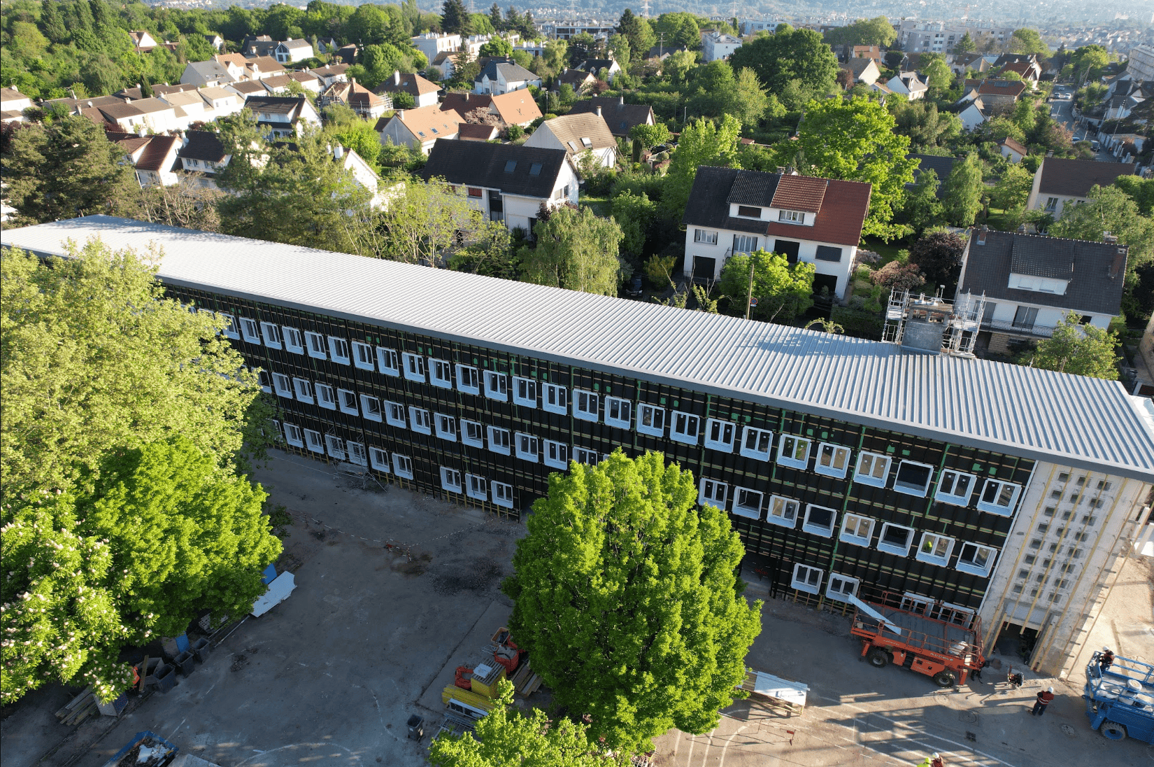 C'est cette approche innovante qui a inspiré la rénovation énergétique de l'école Joliot-Curie. Une partie des travaux a été réalisée hors-site, avec la fabrication en atelier de panneaux préfabriqués en ossature bois intégrant un isolant en paille. Ces modules ont ensuite été posés directement sur les façades existantes. Ce procédé garantit des finitions maîtrisées en environnement contrôlé, tout en réduisant les délais de chantier.