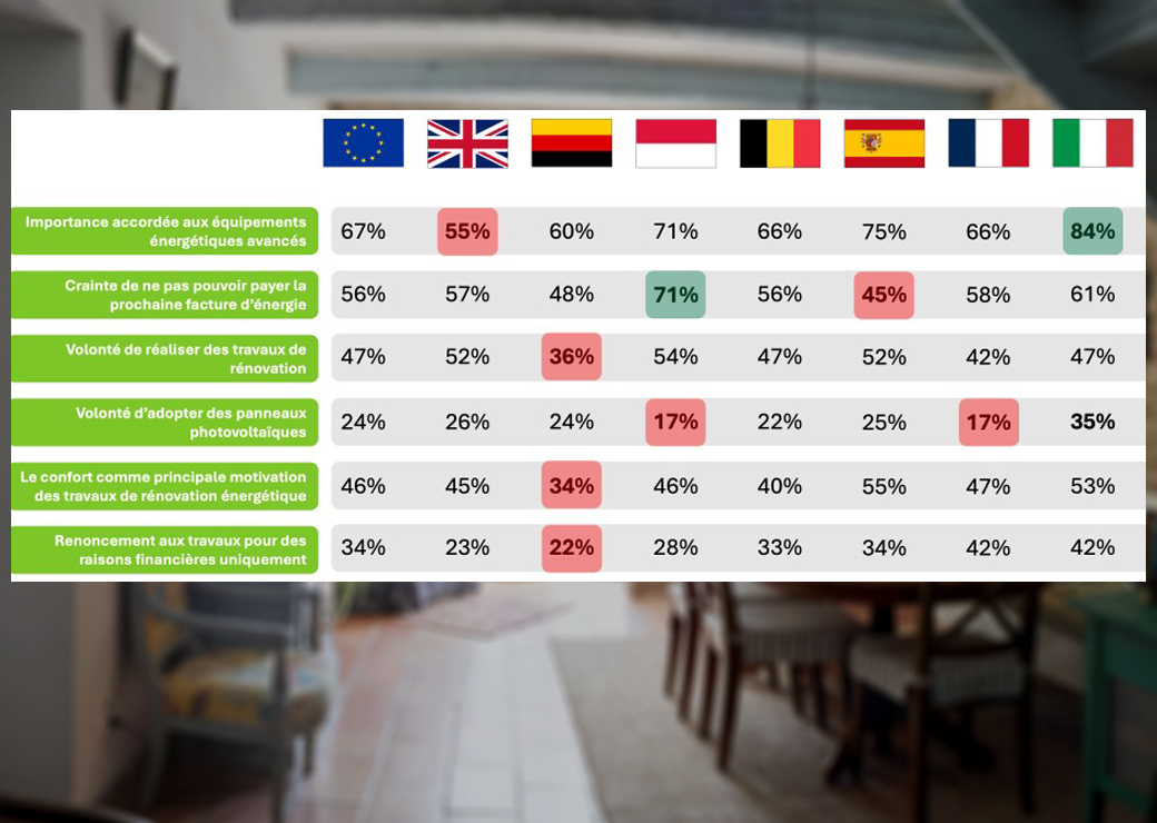 En outre, seulement 46% disent avoir entendu parler avec précision des réglementations visant à améliorer l'efficacité énergétique des logements (telles que les obligations de performance minimale pour la location), un niveau inférieur à l'Italie (55%) ou la Pologne (52%). Ce manque de lisibilité réglementaire et administrative s'ajoute aux préoccupations budgétaires, créant un environnement peu propice à l'engagement massif dans la rénovation énergétique.
