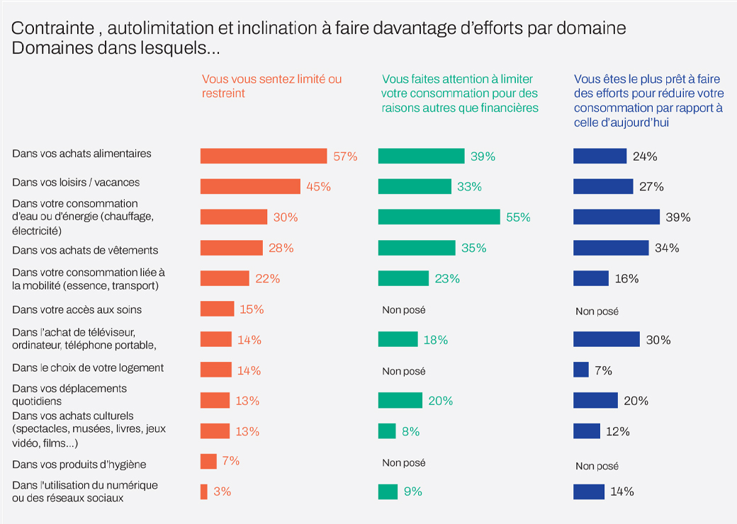 Si leur consommation est déjà contrainte, 86% des personnes interrogées se déclarent prêtes à consentir à des efforts supplémentaires, mais pas dans tous les domaines (39% sur l’eau et l’énergie, 34% sur l’achat de vêtements, mais seulement 7% sur le choix du logement, 12% sur les achats culturels et 16% sur les dépenses liées à la mobilité). Les personnes interrogées attendent par ailleurs des pouvoirs publics "qu’ils aident concrètement à la rénovation des bâtiments (45%) et à la construction de logements bon marché et peu consommateurs de ressources (41%)". Signifiant ainsi que la sobriété en matière de logement n’est pas ou peu de leur ressort. Quant aux autres domaines (mobilité, culture, réseaux sociaux…), les "réponses suggèrent le refus de sacrifier le tissage de liens et l’ouverture aux autres", selon les auteurs.