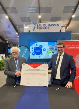 À l’occasion du Carrefour des Gestions Locales de l’Eau à Rennes, Stéphane Lafargue, directeur adjoint de la Banque des Territoires Bretagne, et Michel Demolder, Président de la Collectivité Eau du Bassin Rennais ont signé une convention de prêt pour le financement de la construction d’un nouvel ouvrage de stockage d’eau potable à La Mézière (35).