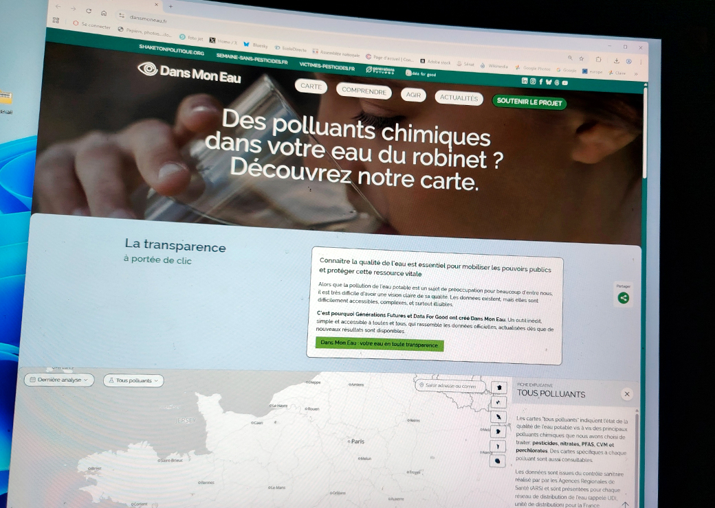 Les ONG Générations Futures et Data For Good ont mis en ligne ce 16 octobre "Dans mon eau", un site proposant une carte interactive des principaux polluants chimiques présents dans l'eau du robinet en France, espérant permettre ainsi "un accès plus facile du public à ces informations".
