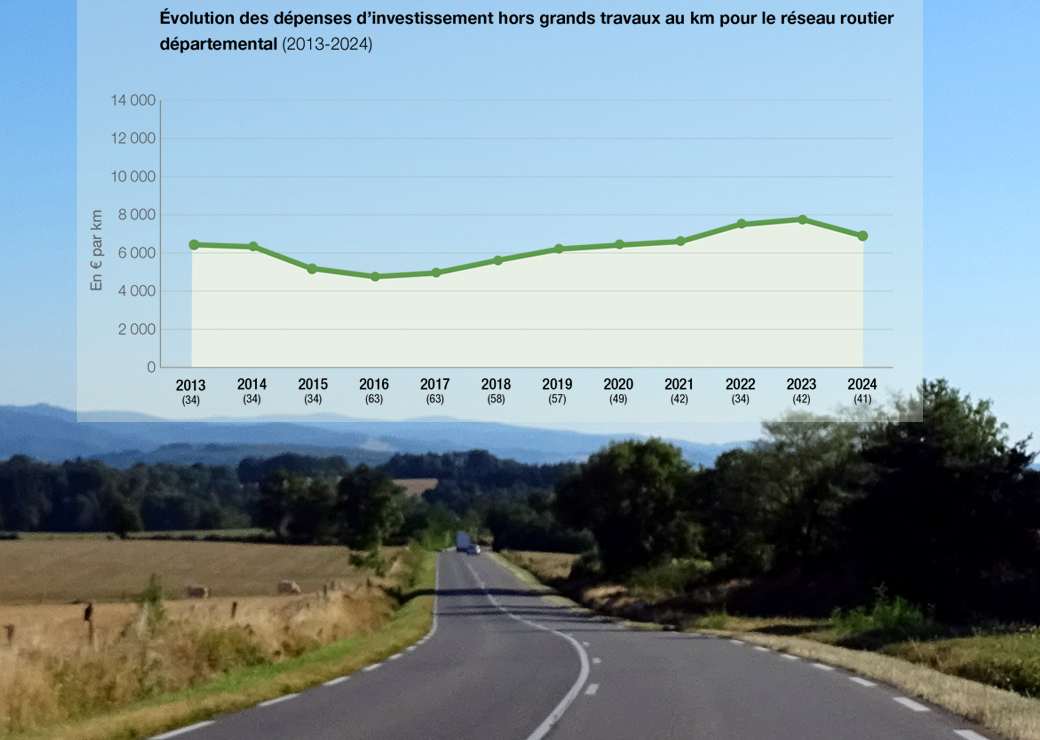 Le rapport 2025 de l'Observatoire national des routes (ONR) fait état de la baisse des investissements des départements dans leur voirie en 2024, une première depuis 2016. Il y voit la conséquence d'un "contexte budgétaire particulièrement contraint" et la traduction que la route reste "une variable d'ajustement" budgétaire. L'ONR redoute que leurs capacités d'investissement continuent de diminuer alors que leur patrimoine doit par ailleurs faire face à l'essor des aléas climatiques.